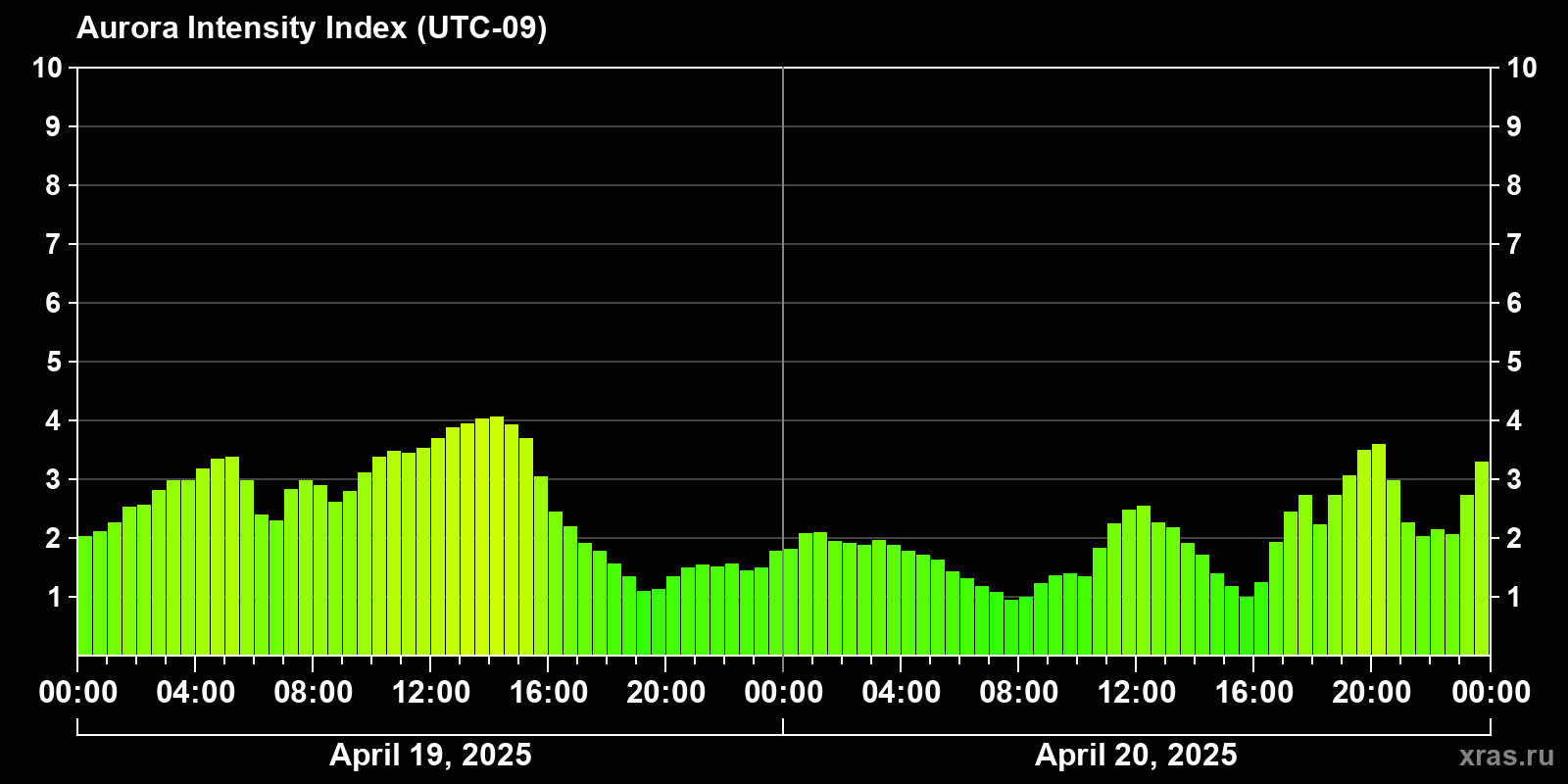 Changes in the auroral intensity index from 2025-04-19 to 2025-04-20 local time