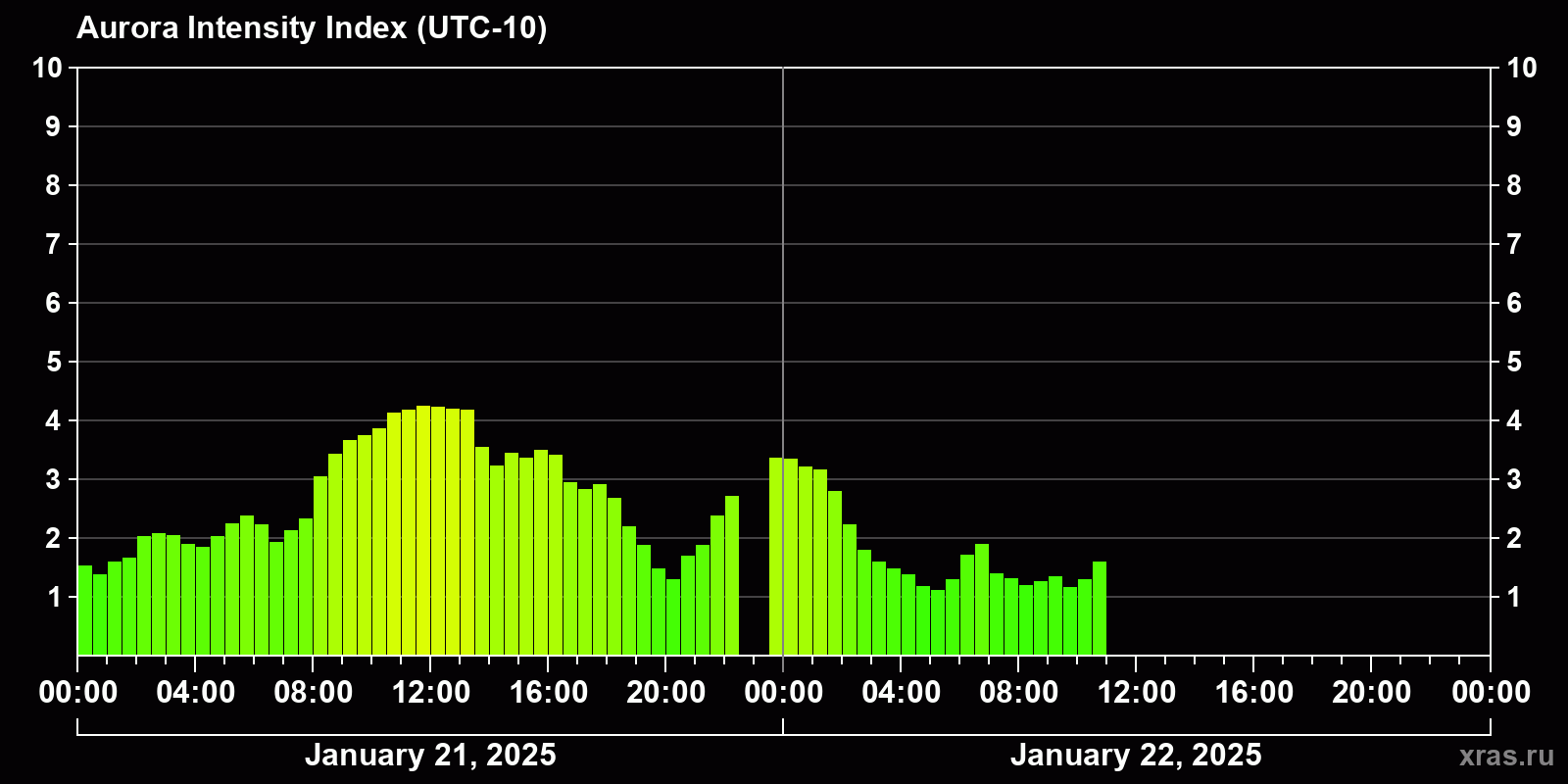 Auroral intensity index and the theoretically possible latitude of observations for nighttime in the Western Hemisphere as of 2025-01-22 10:44 (end of day) local time
