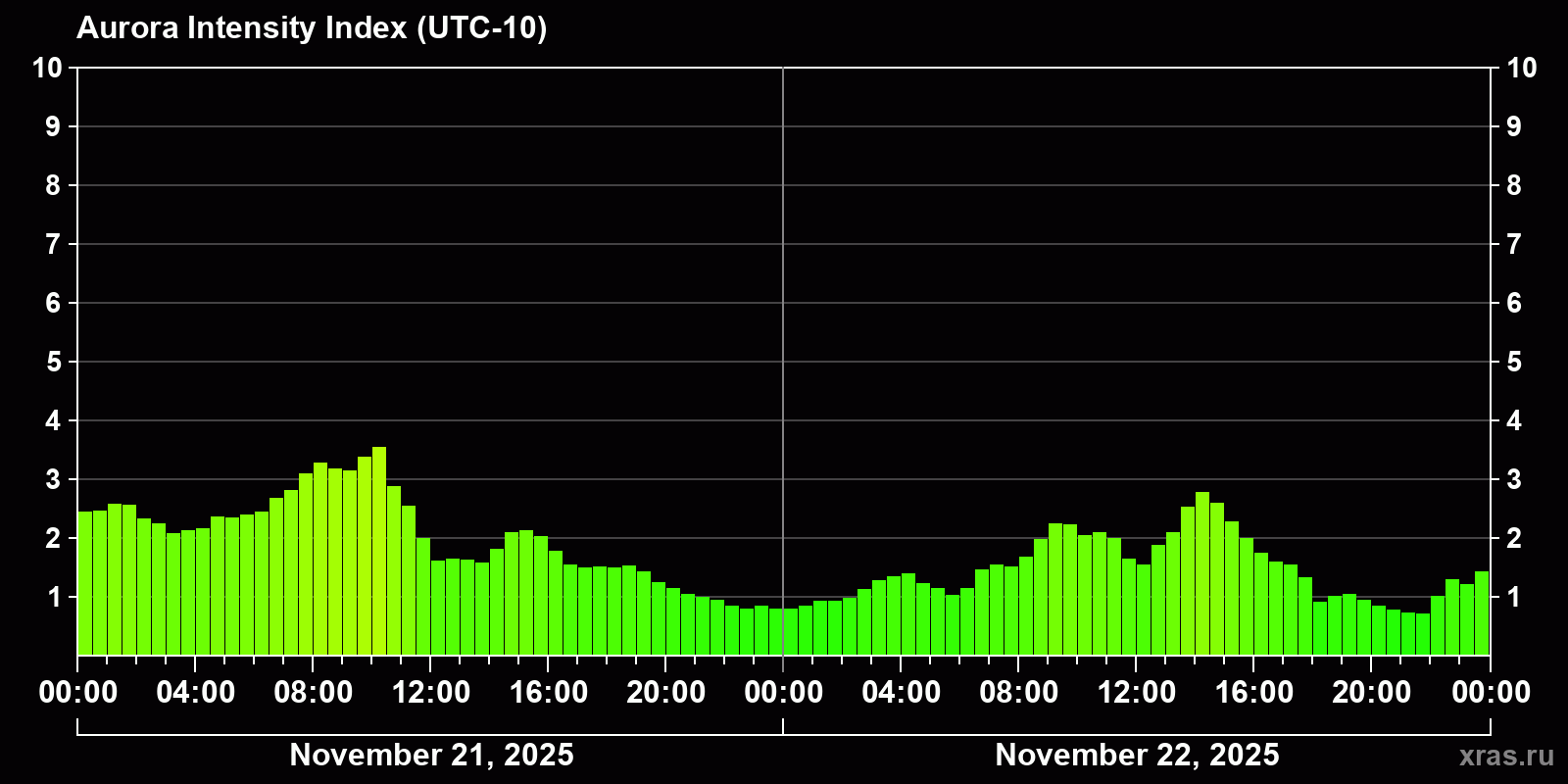 Changes in the auroral intensity index from 2025-11-21 to 2025-11-22 local time
