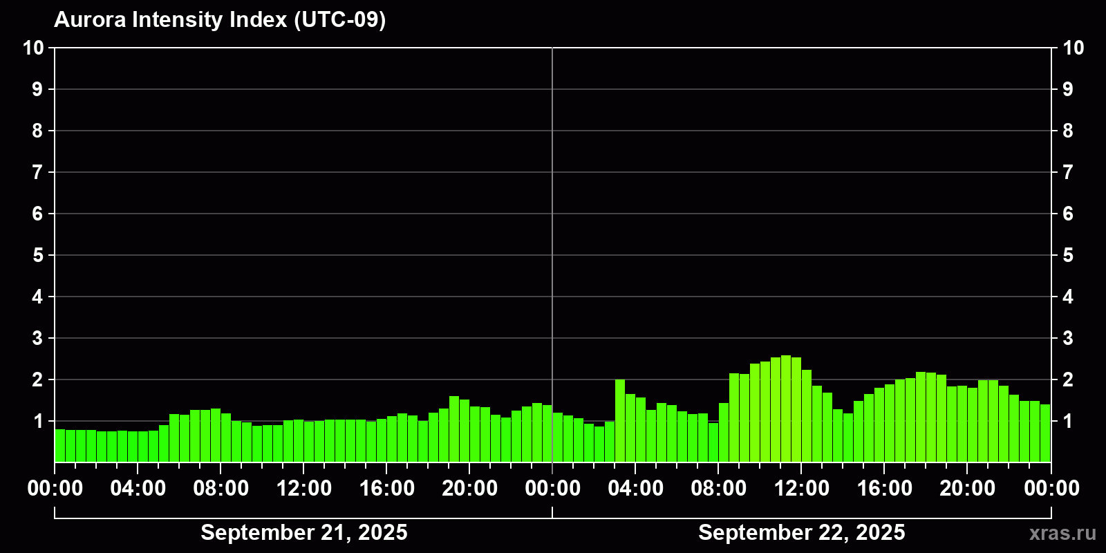 Changes in the auroral intensity index from 2025-09-21 to 2025-09-22 local time