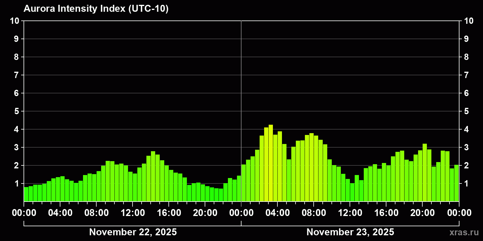 Changes in the auroral intensity index from 2025-11-22 to 2025-11-23 local time