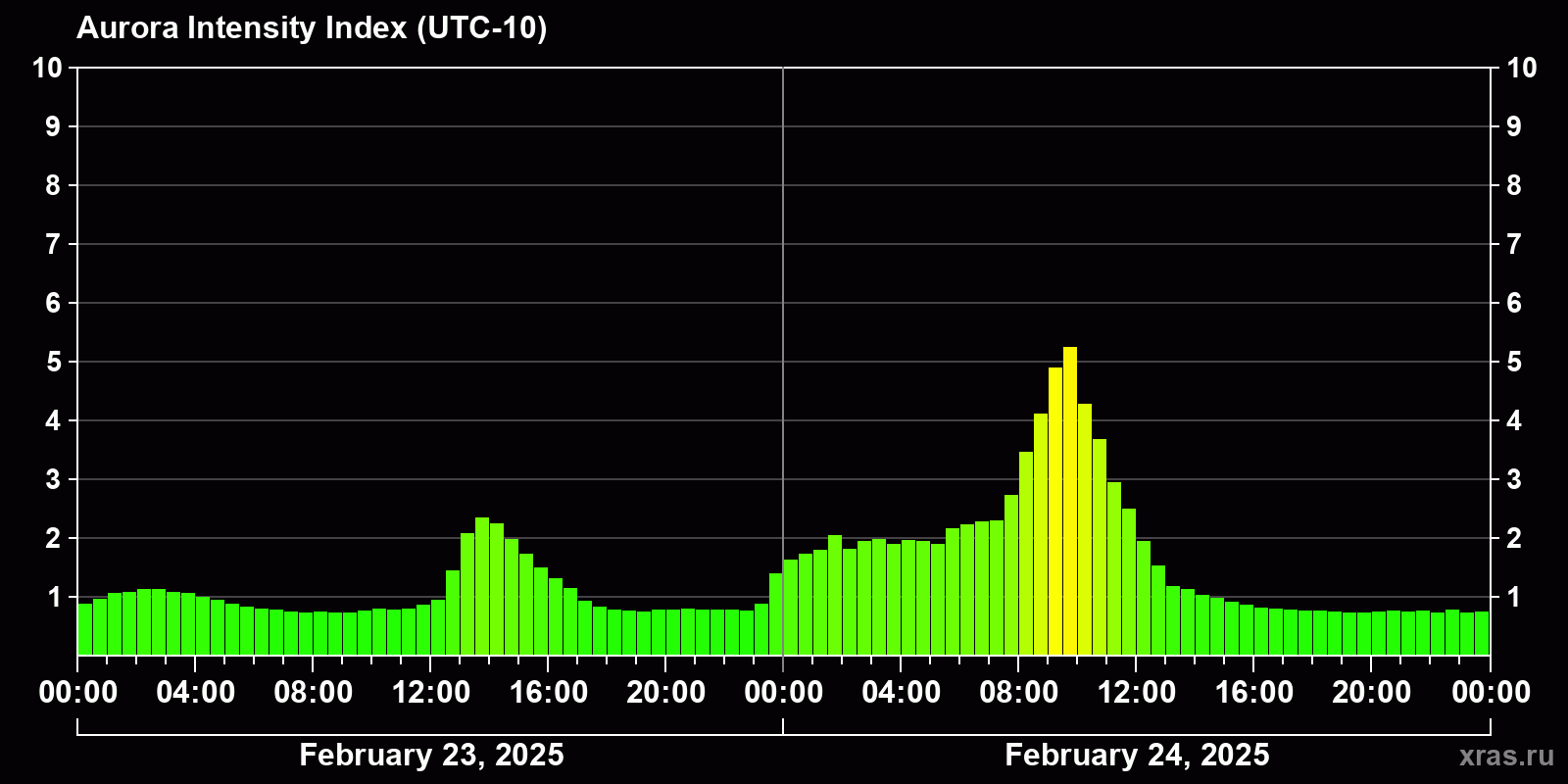 Changes in the auroral intensity index from 2025-02-23 to 2025-02-24 local time