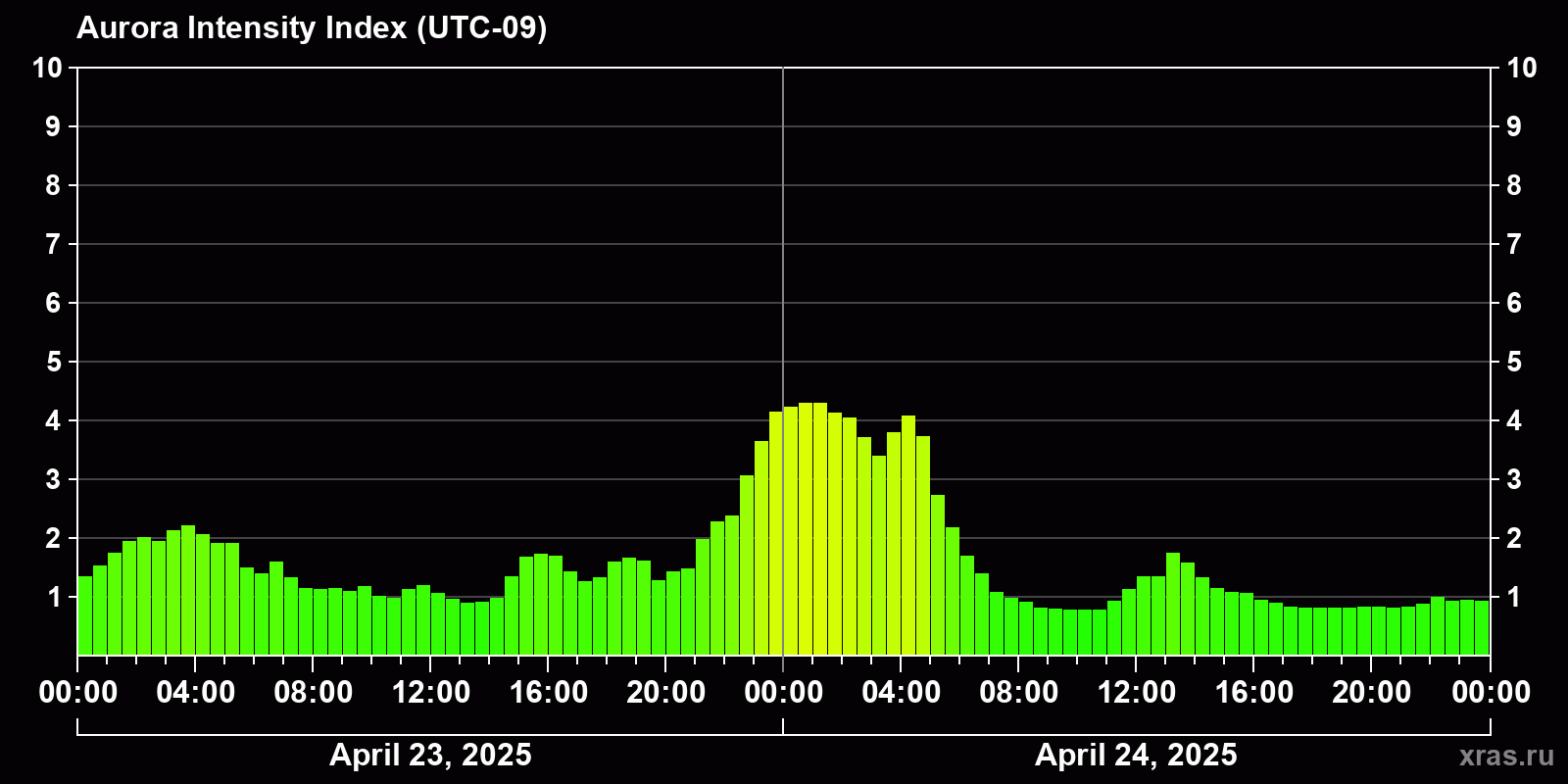 Auroral intensity index and the theoretically possible latitude of observations for nighttime in the Western Hemisphere as of 2025-04-24 23:53 (end of day) local time