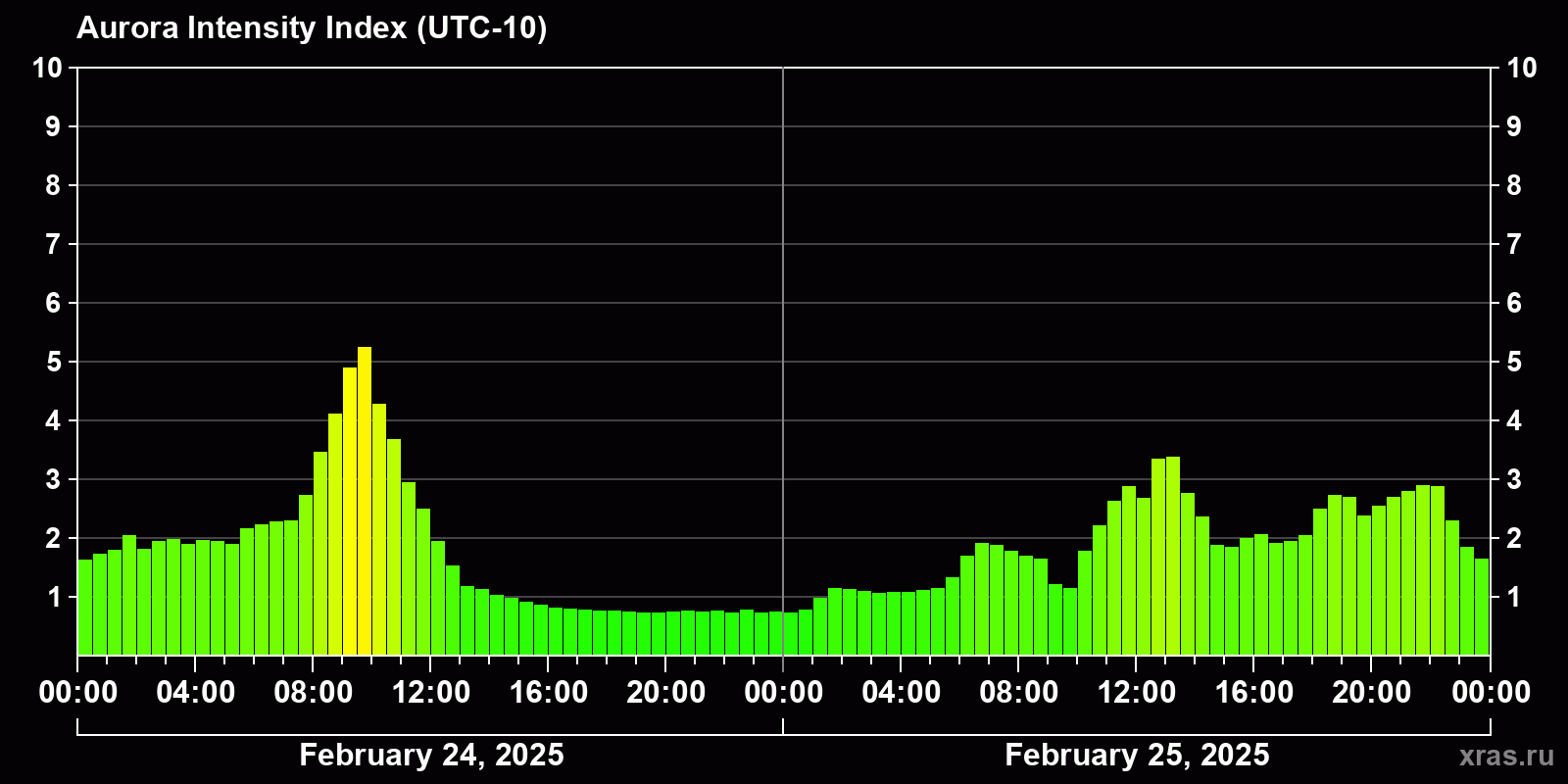 Changes in the auroral intensity index from 2025-02-24 to 2025-02-25 local time