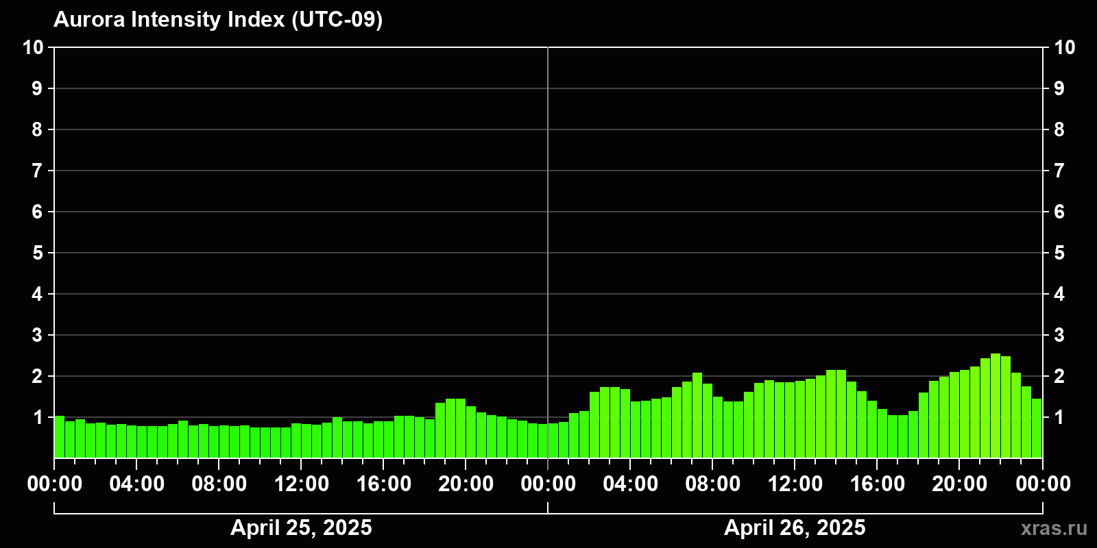 Changes in the auroral intensity index from 2025-04-25 to 2025-04-26 local time