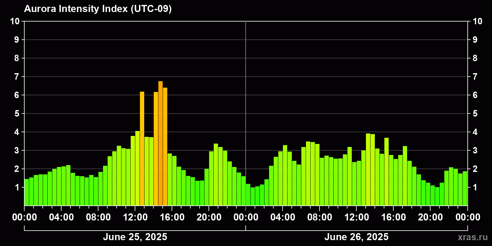 Changes in the auroral intensity index from 2025-06-25 to 2025-06-26 local time