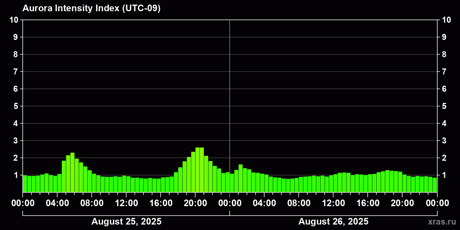 Changes in the auroral intensity index from 2025-08-25 to 2025-08-26 local time
