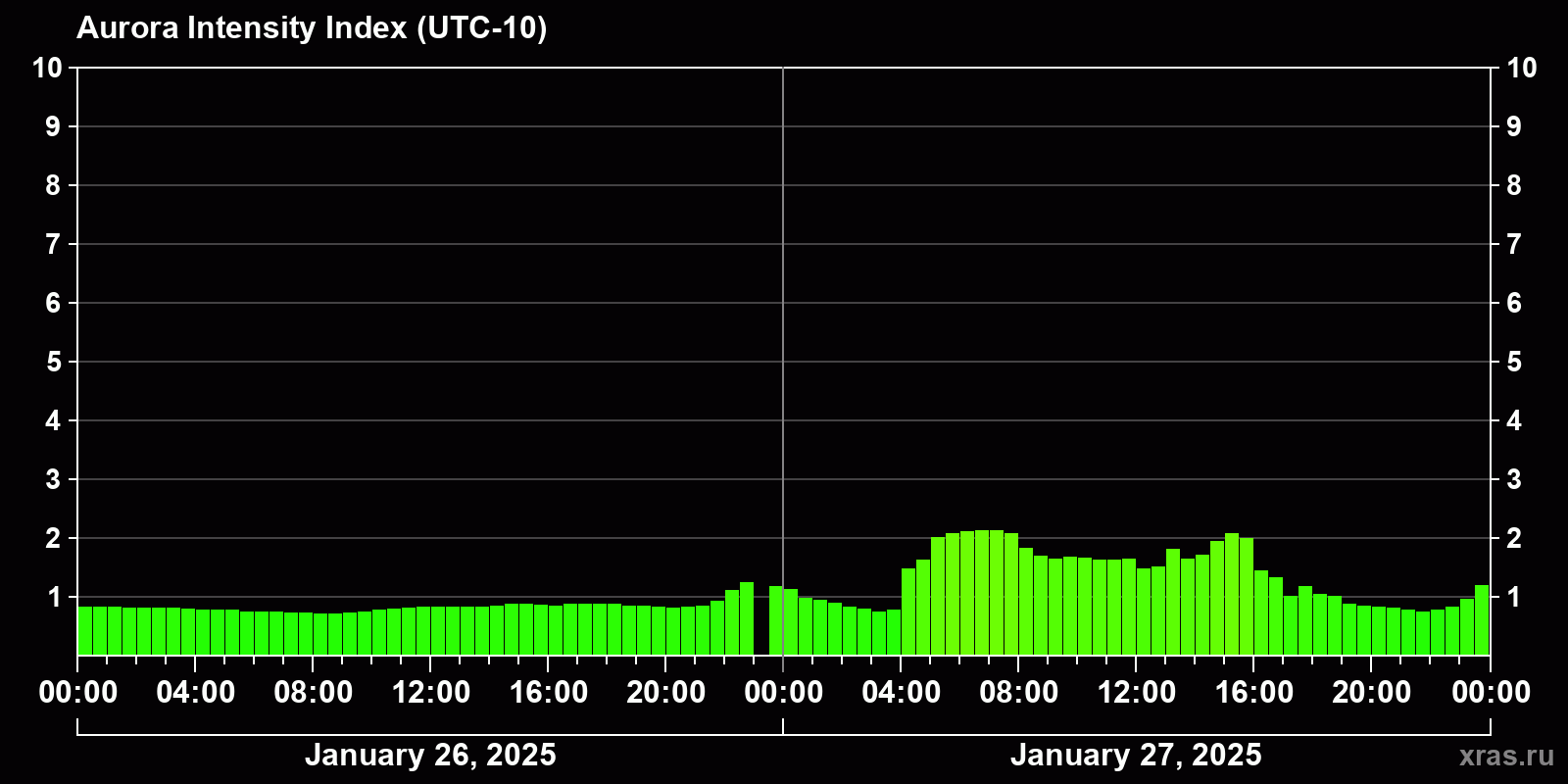 Changes in the auroral intensity index from 2025-01-26 to 2025-01-27 local time