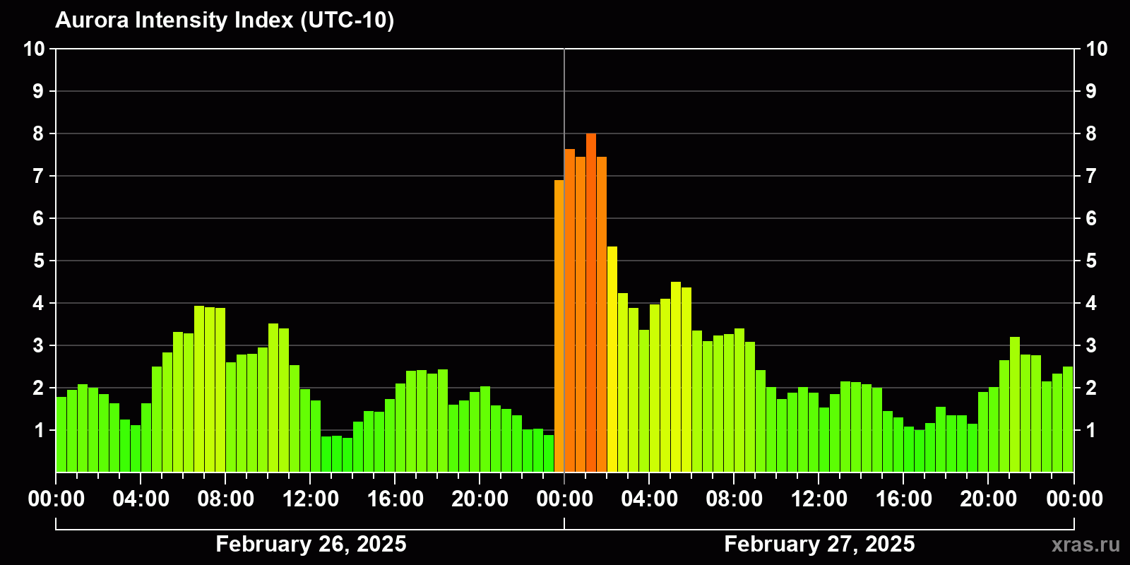 Changes in the auroral intensity index from 2025-02-26 to 2025-02-27 local time