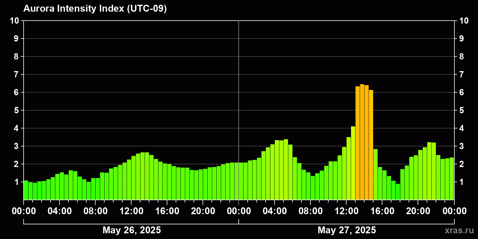 Changes in the auroral intensity index from 2025-05-26 to 2025-05-27 local time