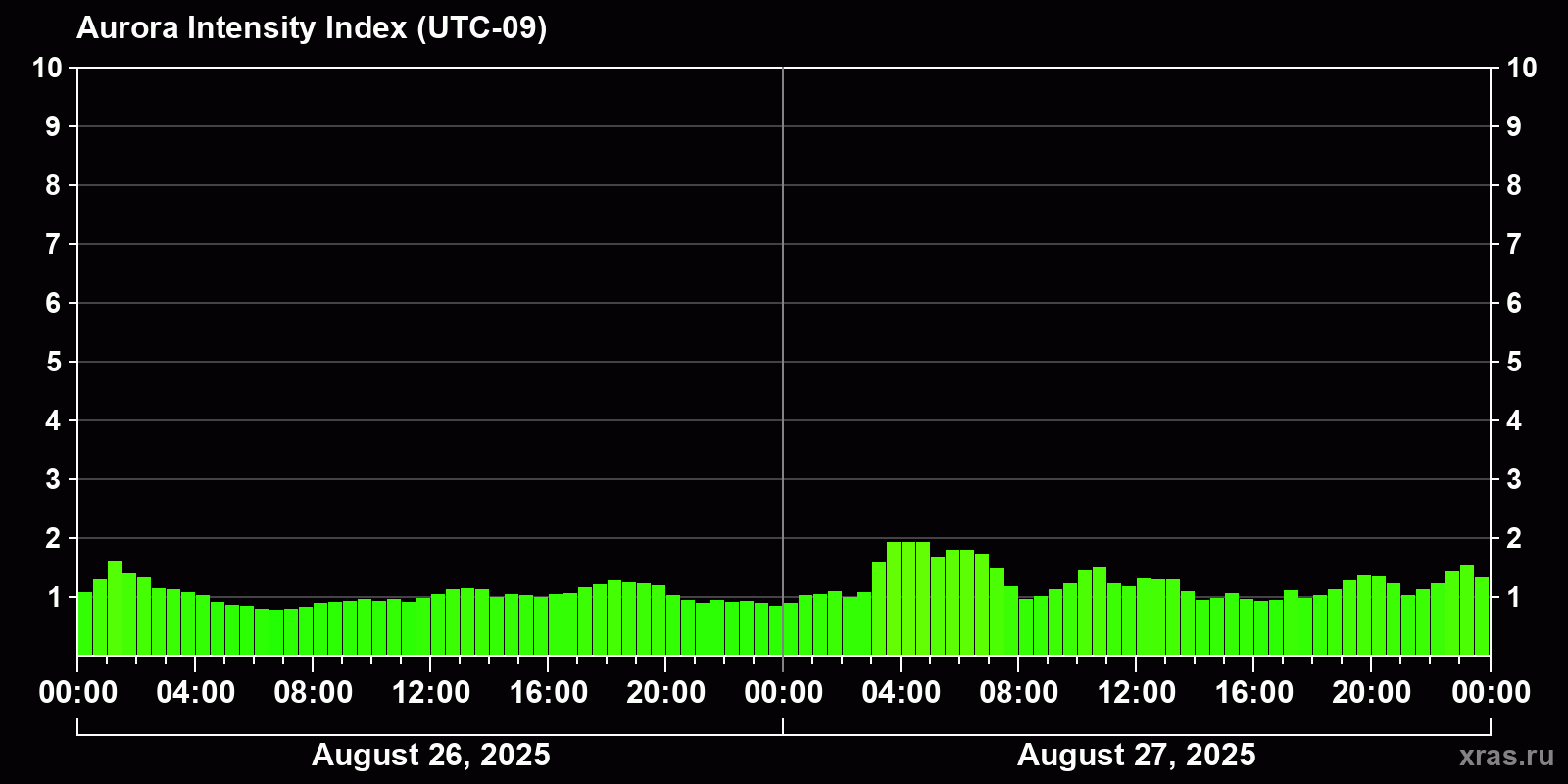 Changes in the auroral intensity index from 2025-08-26 to 2025-08-27 local time