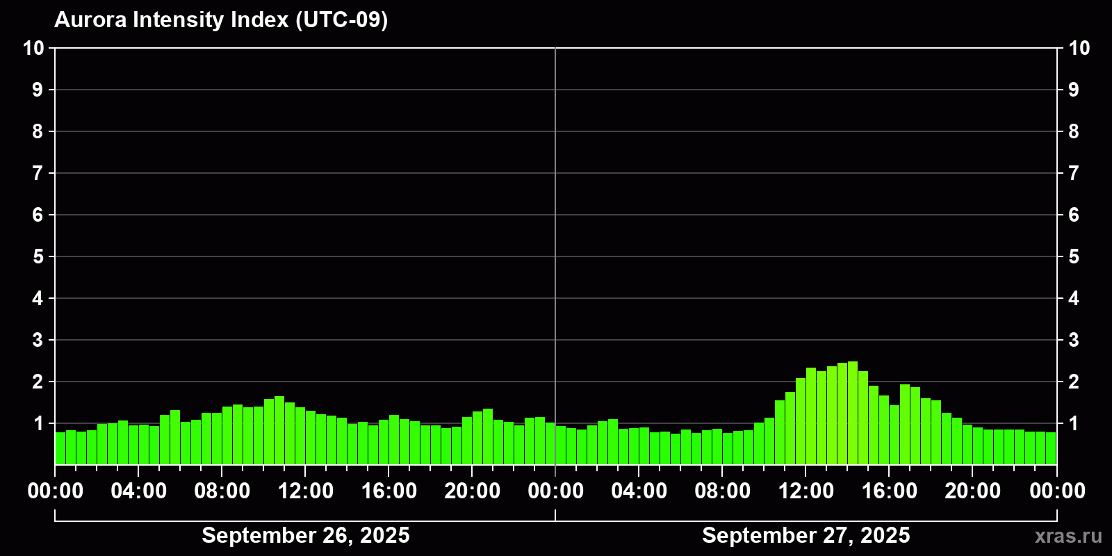Changes in the auroral intensity index from 2025-09-26 to 2025-09-27 local time
