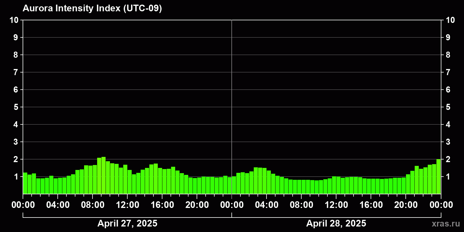 Changes in the auroral intensity index from 2025-04-27 to 2025-04-28 local time