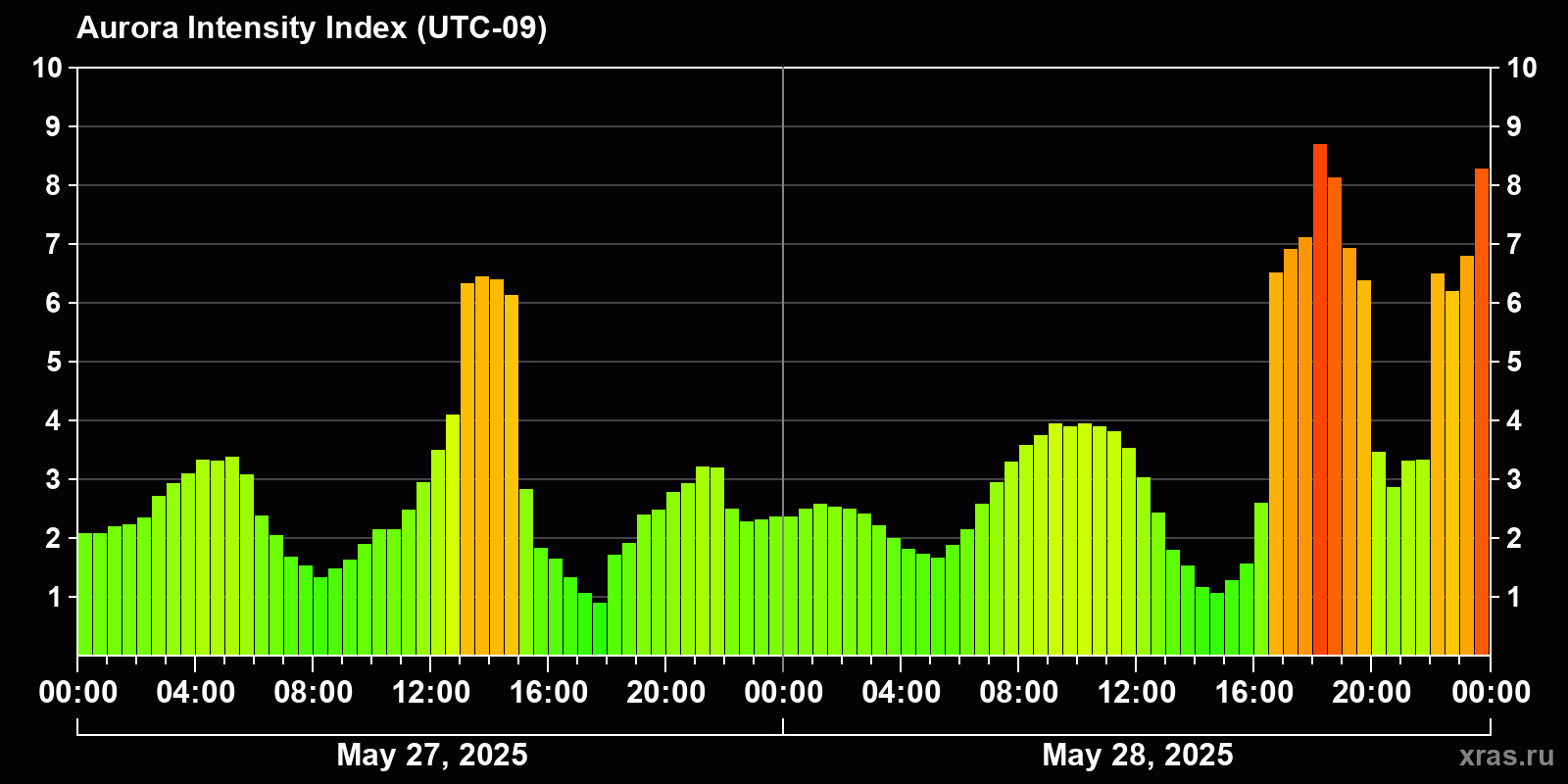 Changes in the auroral intensity index from 2025-05-27 to 2025-05-28 local time
