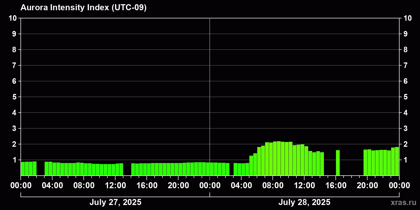 Changes in the auroral intensity index from 2025-07-27 to 2025-07-28 local time