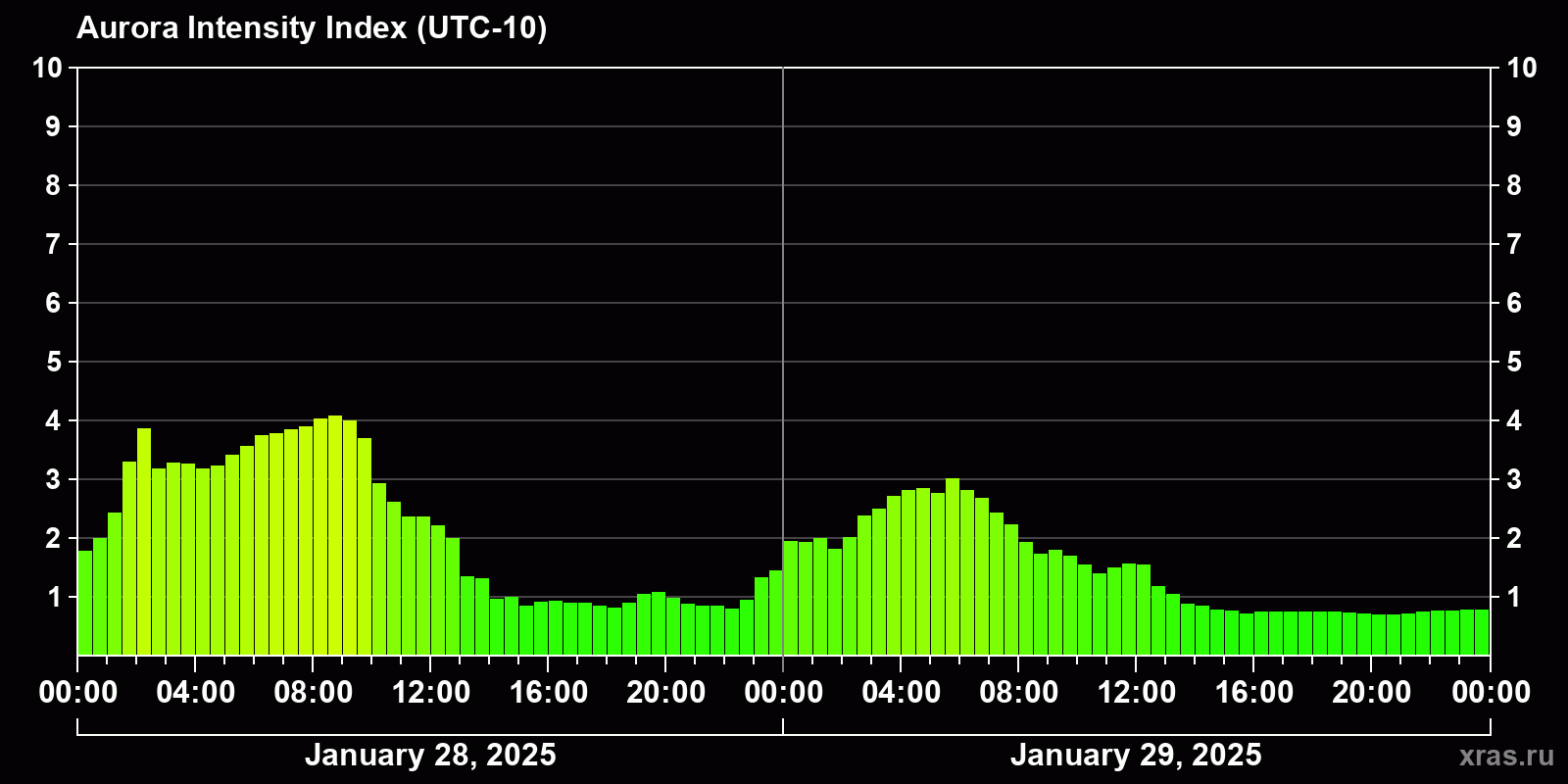 Changes in the auroral intensity index from 2025-01-28 to 2025-01-29 local time