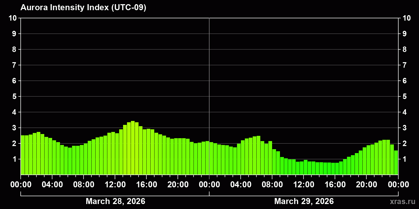 Changes in the auroral intensity index from 2026-03-28 to 2026-03-29 local time