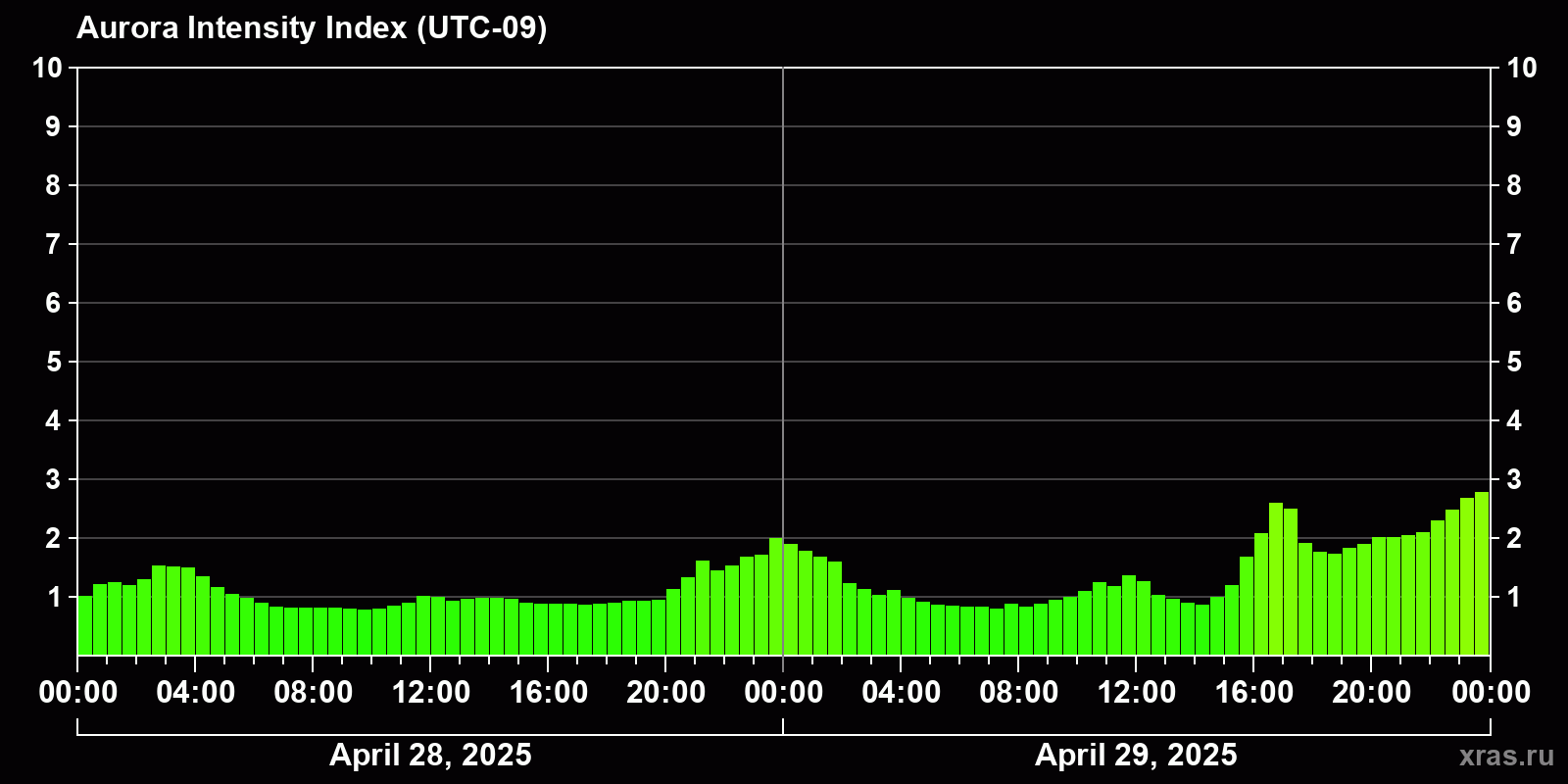 Changes in the auroral intensity index from 2025-04-28 to 2025-04-29 local time