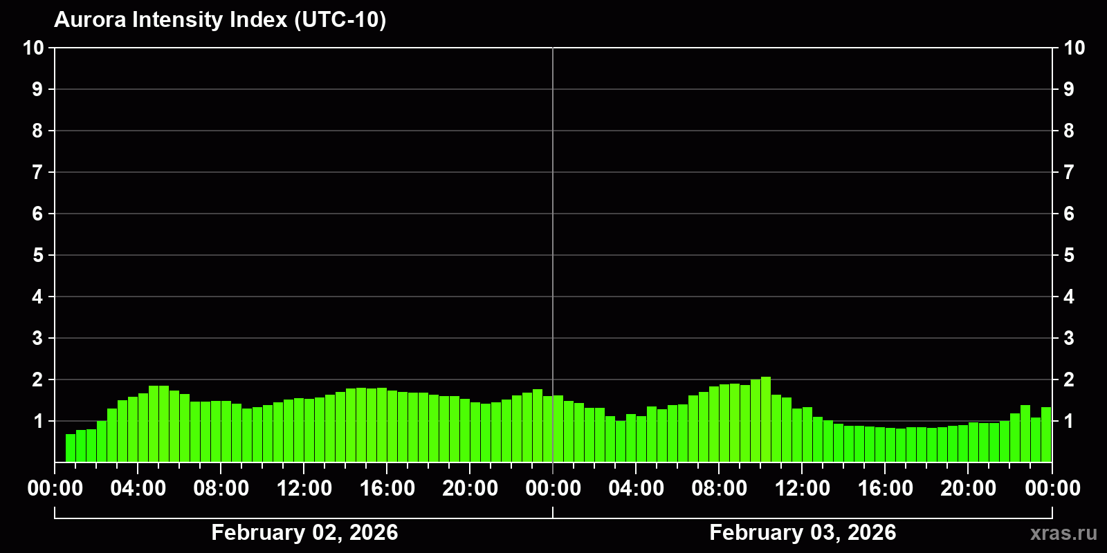 Changes in the auroral intensity index from 2026-02-02 to 2026-02-03 local time