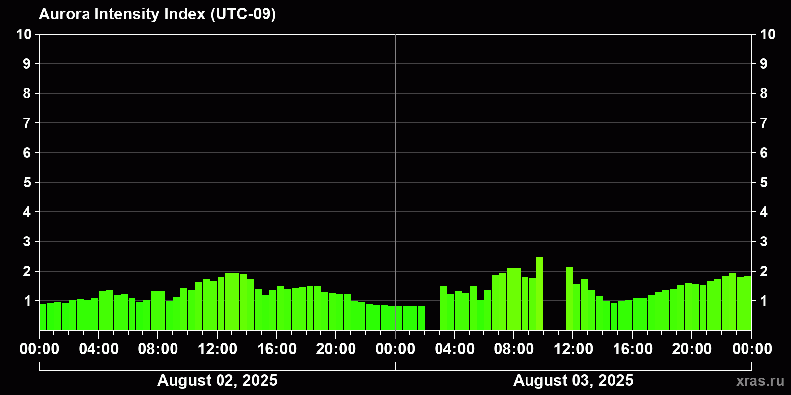 Changes in the auroral intensity index from 2025-08-02 to 2025-08-03 local time