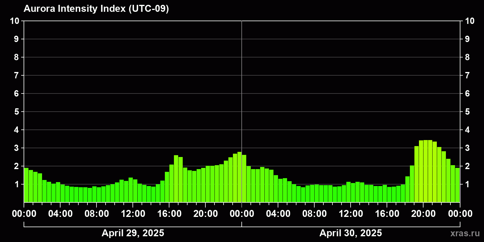 Changes in the auroral intensity index from 2025-04-29 to 2025-04-30 local time