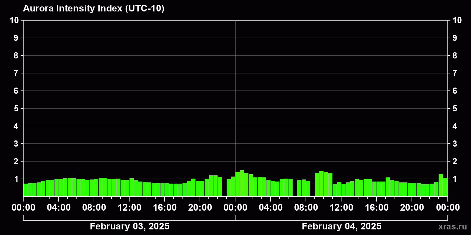 Changes in the auroral intensity index from 2025-02-03 to 2025-02-04 local time