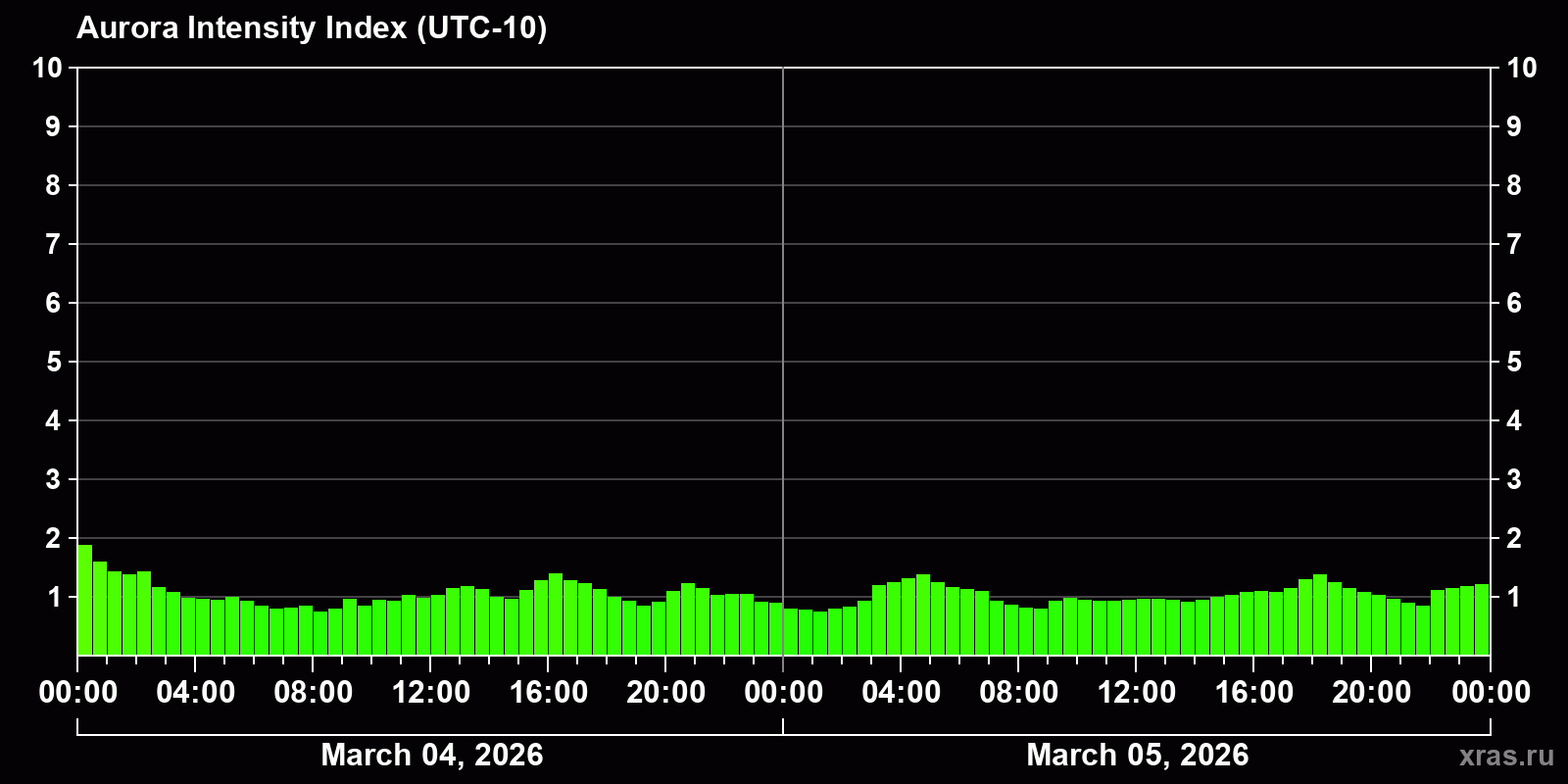 Changes in the auroral intensity index from 2026-03-04 to 2026-03-05 local time