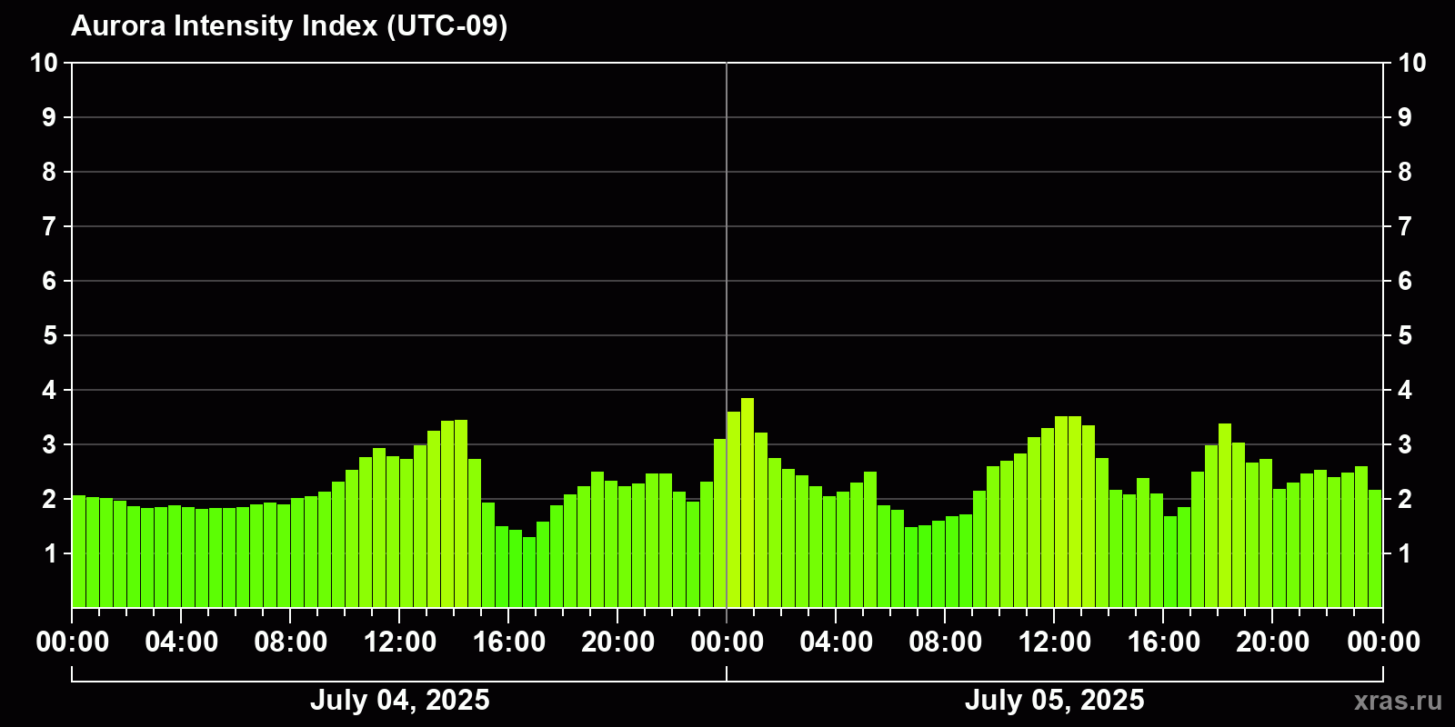 Changes in the auroral intensity index from 2025-07-04 to 2025-07-05 local time