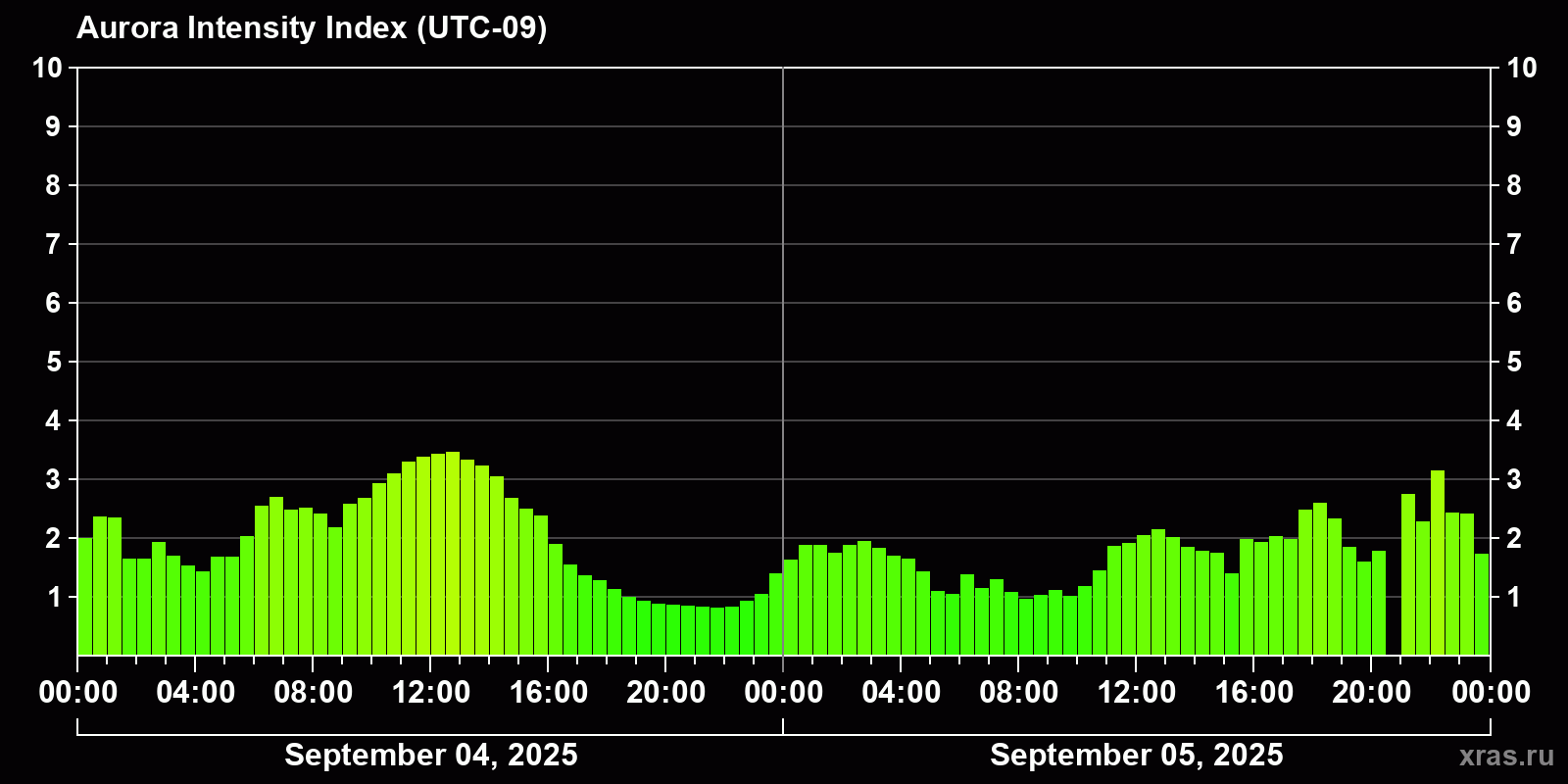 Changes in the auroral intensity index from 2025-09-04 to 2025-09-05 local time
