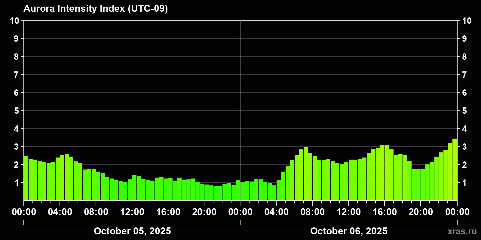 Changes in the auroral intensity index from 2025-10-05 to 2025-10-06 local time