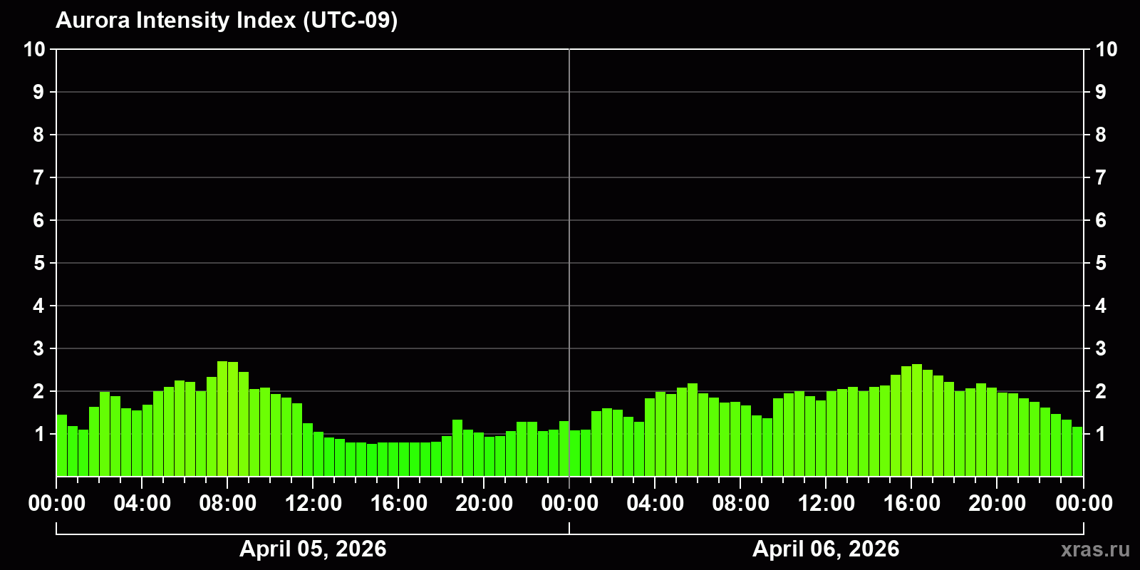 Changes in the auroral intensity index from 2026-04-05 to 2026-04-06 local time