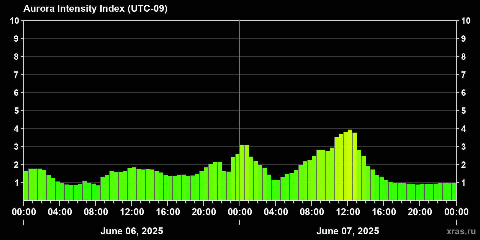 Changes in the auroral intensity index from 2025-06-06 to 2025-06-07 local time