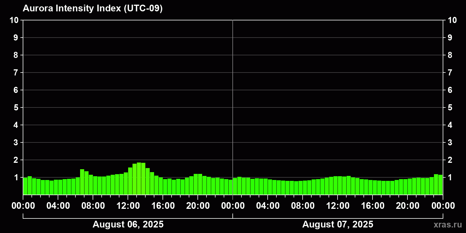 Changes in the auroral intensity index from 2025-08-06 to 2025-08-07 local time