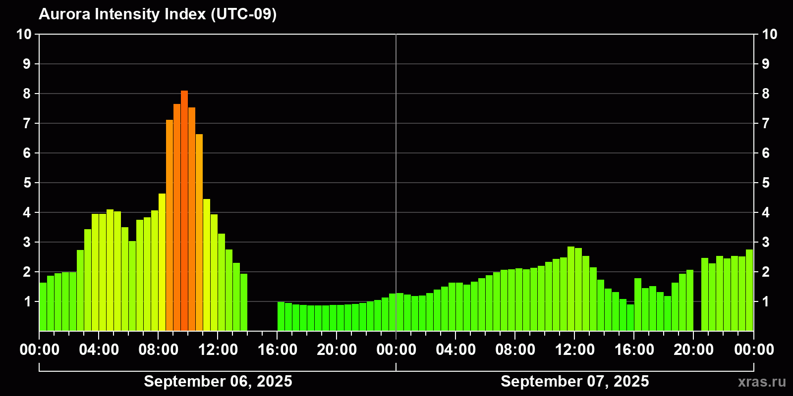 Changes in the auroral intensity index from 2025-09-06 to 2025-09-07 local time