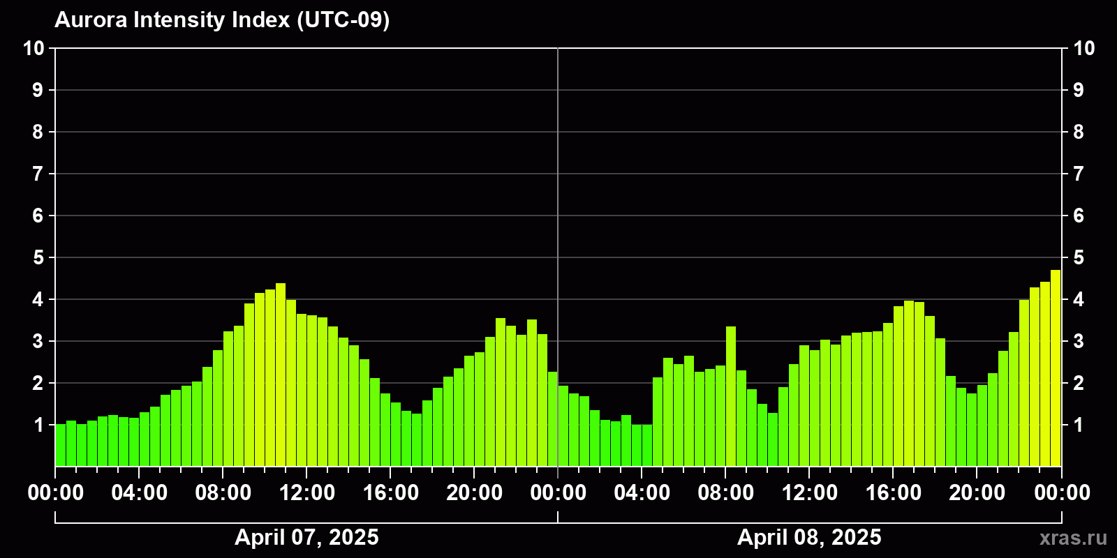 Changes in the auroral intensity index from 2025-04-07 to 2025-04-08 local time