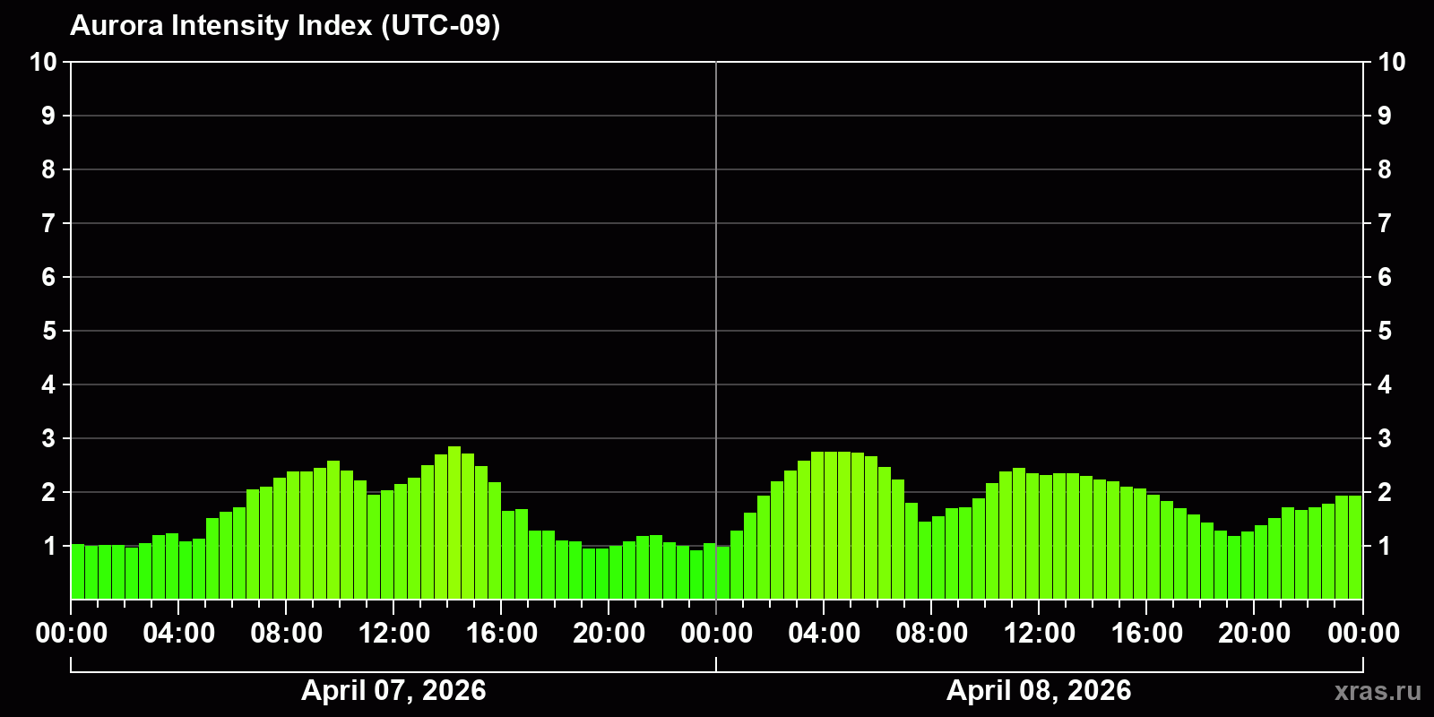 Auroral intensity index and the theoretically possible latitude of observations for nighttime in the Western Hemisphere as of 2026-04-08 23:50 (end of day) local time