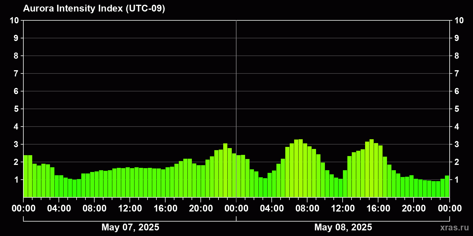 Changes in the auroral intensity index from 2025-05-07 to 2025-05-08 local time