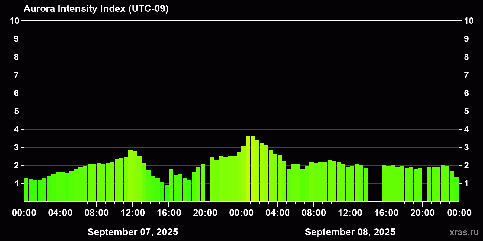 Changes in the auroral intensity index from 2025-09-07 to 2025-09-08 local time