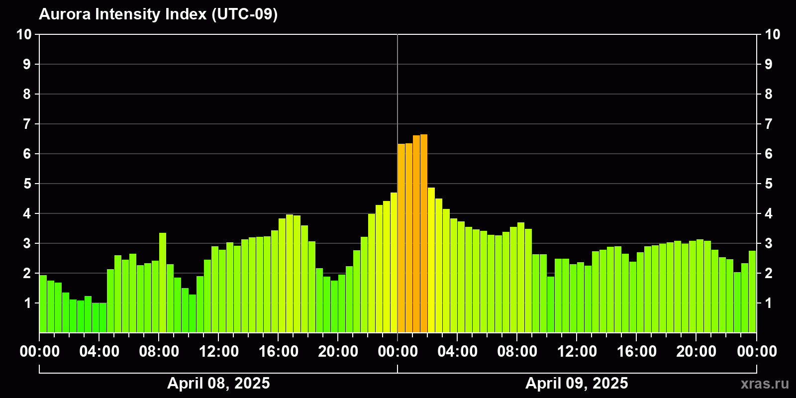 Changes in the auroral intensity index from 2025-04-08 to 2025-04-09 local time
