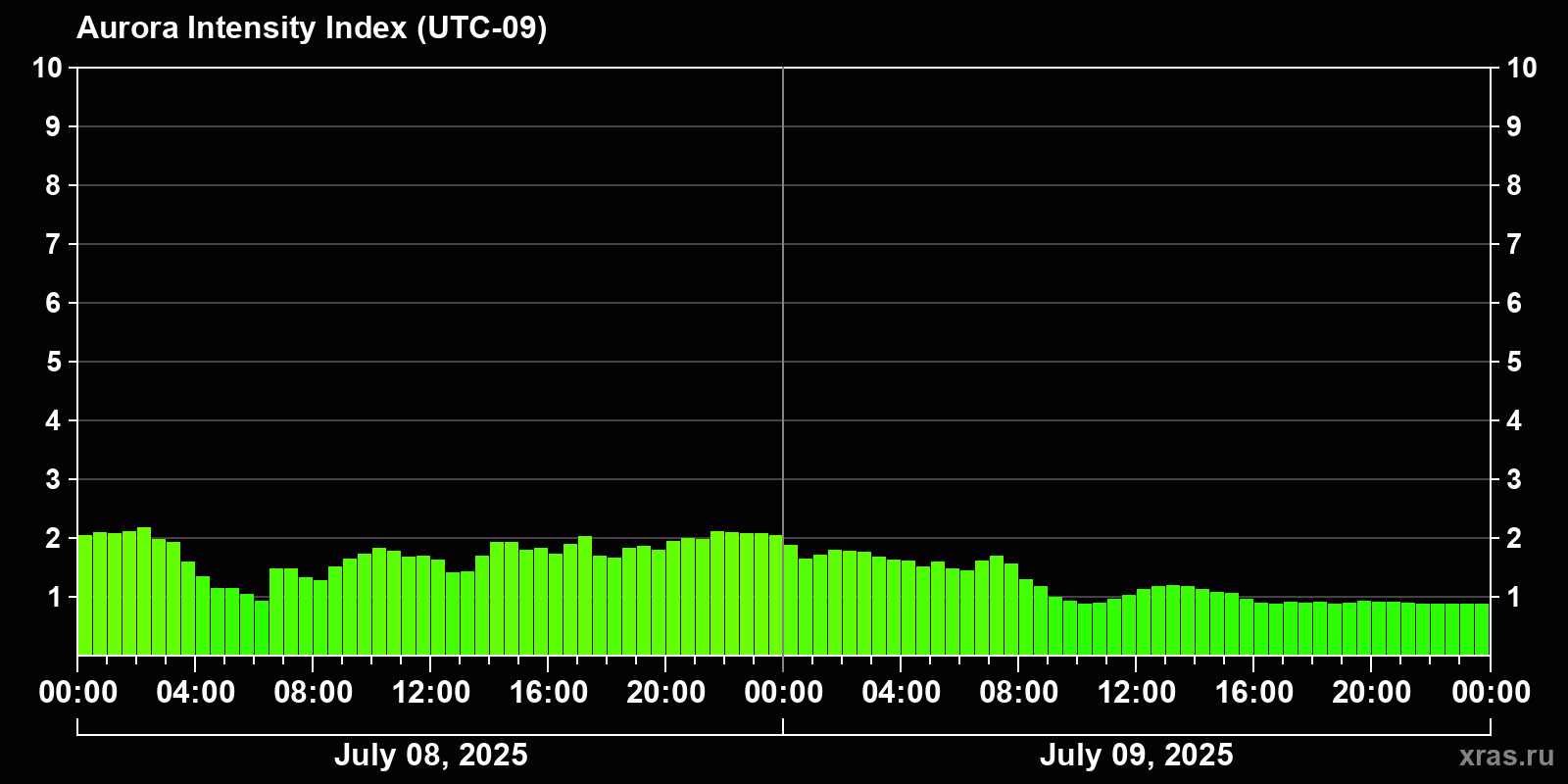 Changes in the auroral intensity index from 2025-07-08 to 2025-07-09 local time