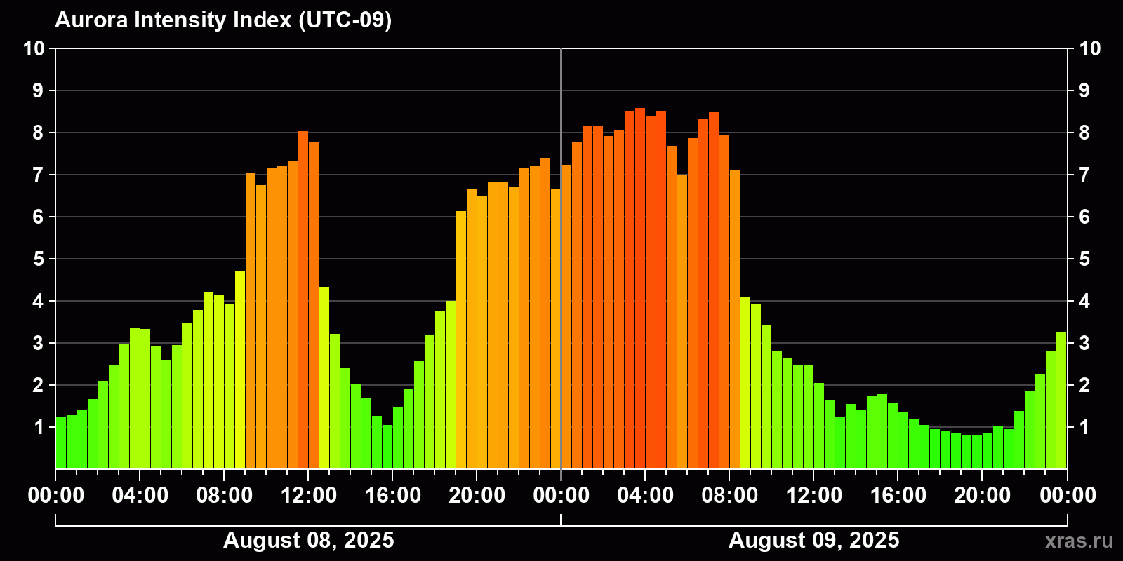 Changes in the auroral intensity index from 2025-08-08 to 2025-08-09 local time