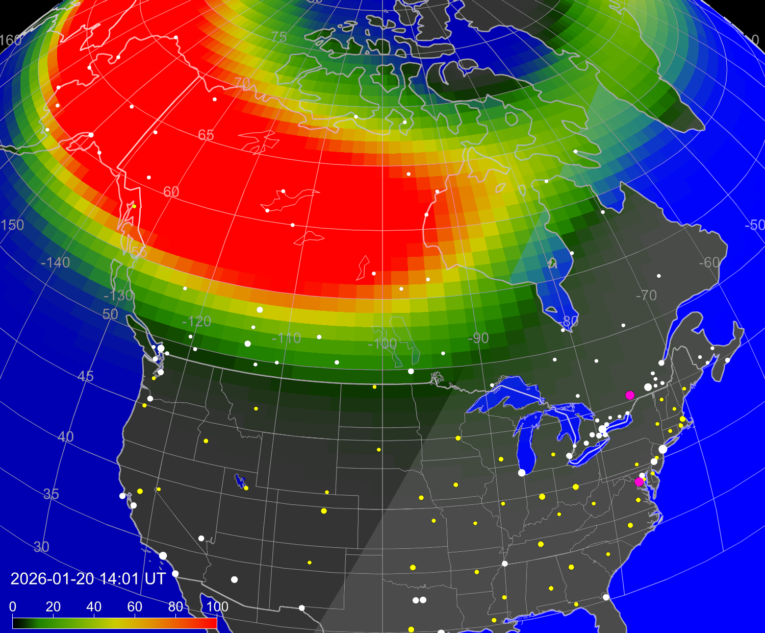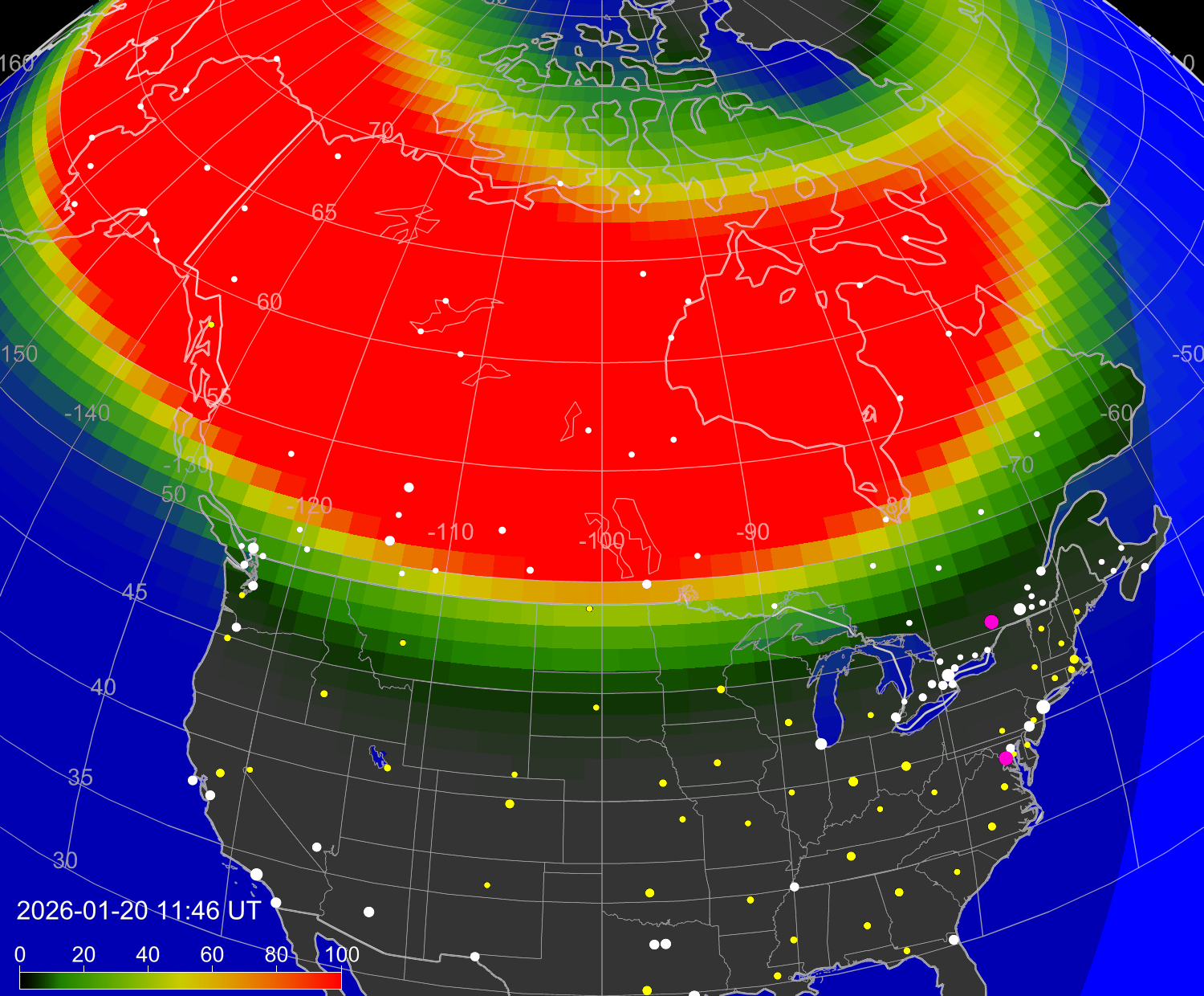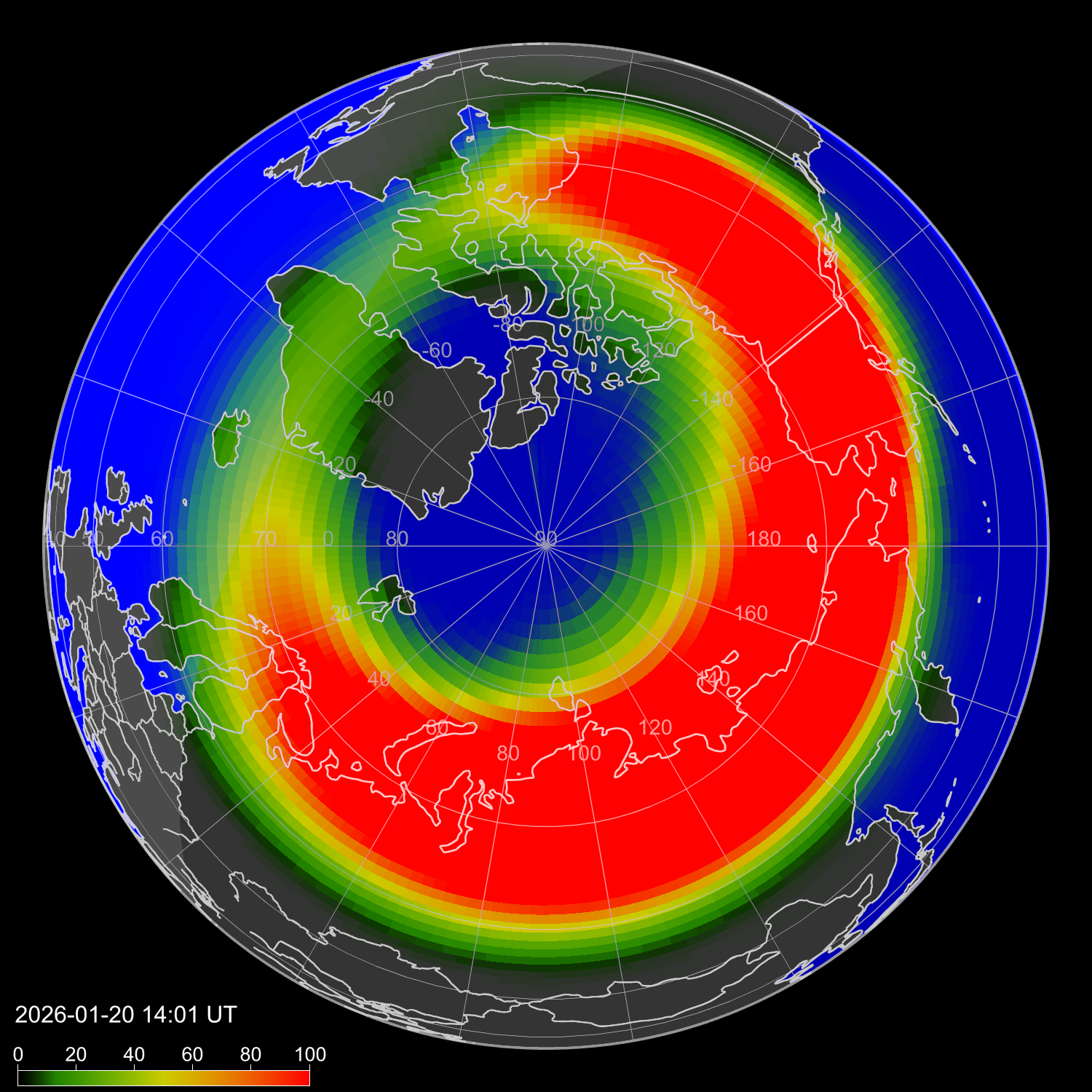 Изменения и часовой прогноз индекса интенсивности полярных сияний с 2026-01-20 по 2026-01-21