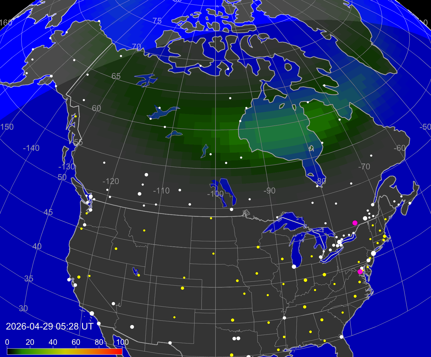 Probability of northern lights (auroras) in cities of United States