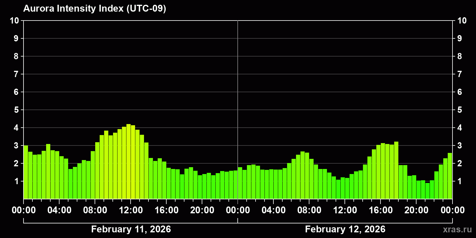 Changes in the auroral intensity index from 2026-02-11 to 2026-02-12 local time