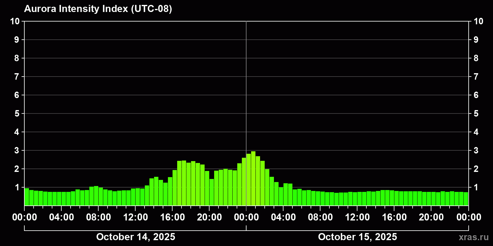 Changes in the auroral intensity index from 2025-10-14 to 2025-10-15 local time