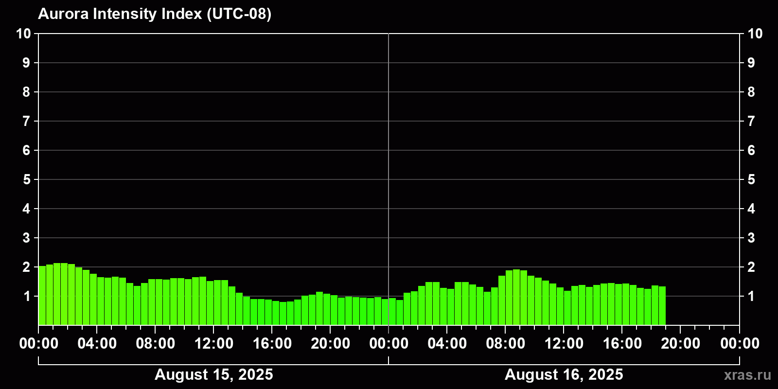 Changes in the auroral intensity index from 2025-08-15 to 2025-08-16 local time