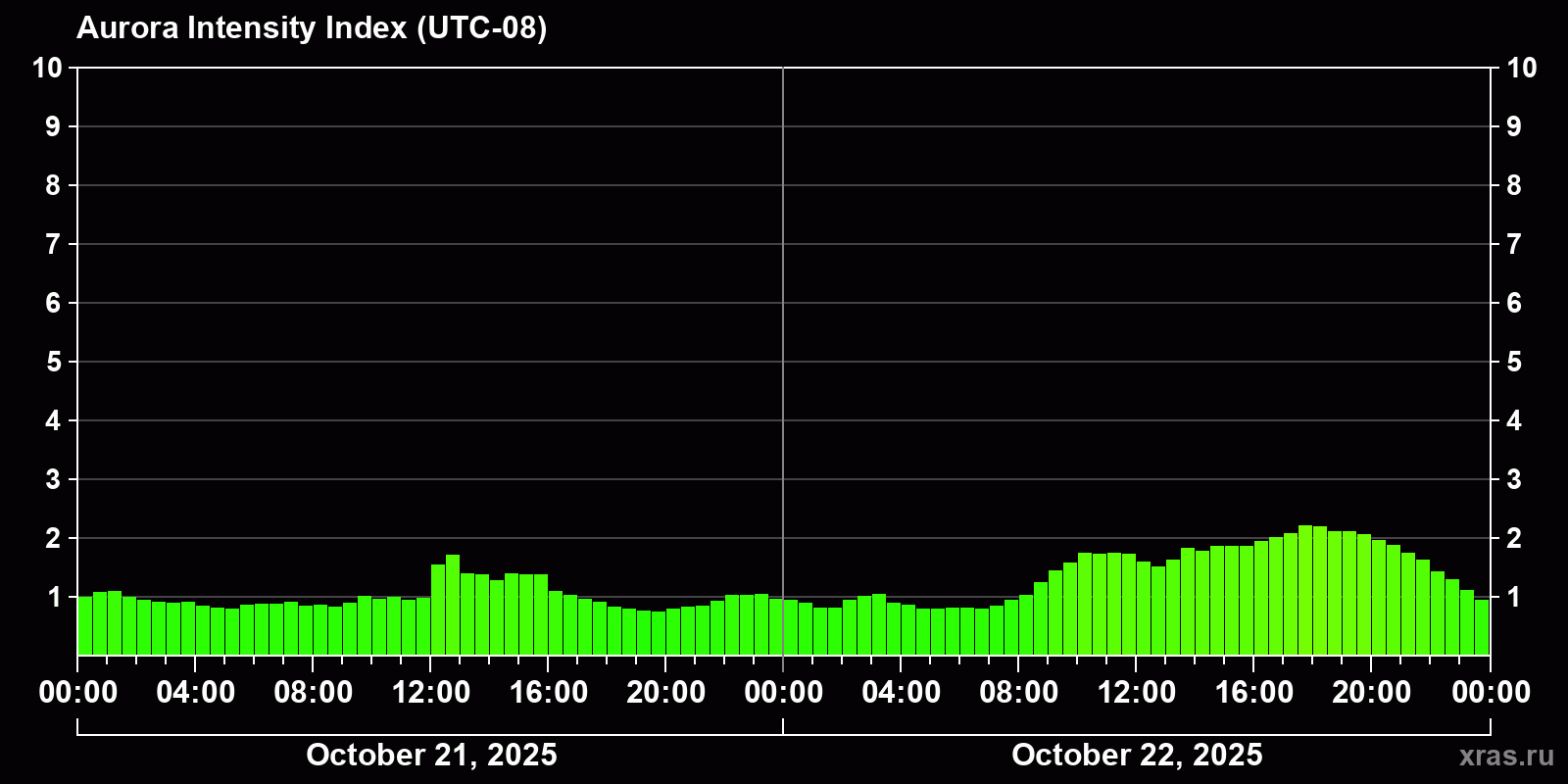 Changes in the auroral intensity index from 2025-10-21 to 2025-10-22 local time