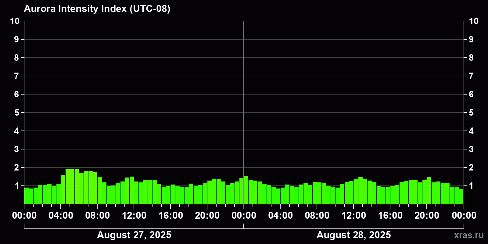 Changes in the auroral intensity index from 2025-08-27 to 2025-08-28 local time