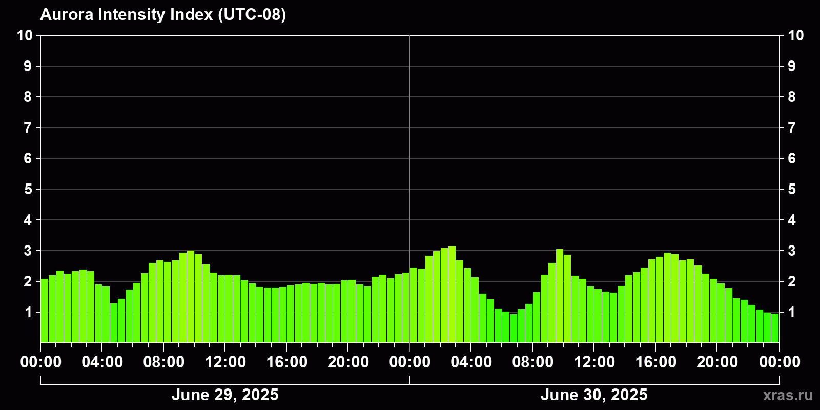 Changes in the auroral intensity index from 2025-06-29 to 2025-06-30 local time
