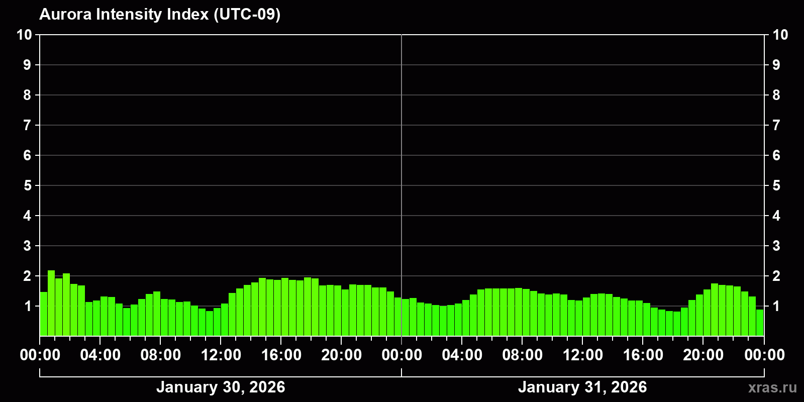 Changes in the auroral intensity index from 2026-01-30 to 2026-01-31 local time